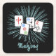 Paper coasters with Mahjong game tiles and blue sunburst on black background and customizable text. Perfect for your next Mahjong party or get together