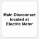 A sheet of six sticker labels with the words "Main Disconnect located at Electric Meter" printed on all stickers in black letters on a white background