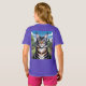 Dieser T - Shirt zeigt ein digitales Bild einer Maine Coon Katze in einem Hof. Die Katze hat markante Tabbiermarkierungen mit schwarzem, braunem und weißem Fell, großen goldenen Augen und rosa Innenohren. Der Ausdruck der Katze ist wachsam und freundlich mit einem leichten Lächeln. Im Hintergrund befindet sich auf der links Seite ein Adirondack-Stuhl aus Holz, auf der rechten Seite ein Grauhaus und auf der rechten Seite eine Blume mit Töpfen und rot-gelben Blüten. Im Garten befinden sich rosa Tulpen im Vordergrund, grünes Gras und grüne Bäume. Der Himmel ist hell blau mit weißen flauschigen Wolken. Das Bild hat einen Comic-ähnlichen Stil mit lebhaften Farben. Das Fell der Katze ist detailliert mit einzelnen Strängen, die besonders rund um den Hals und den Brustbereich sichtbar sind. Die Komposition schafft eine friedliche Sommergarten-Szene mit der Katze als zentralem Brennpunkt. Der T - Shirt ist ein Mädchen lila T - Shirt.
