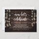 Maintenant célébrons, Carte d'annonce de mariage / faire-part, sur fond de Bois de ferme Rustique, avec des guirlandes lumineuses. C'est parfait pour votre réception de mariage et fête de célébration après-mariage. Ajoutez vos détails avec la même police / lettrage.