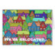 Graphique avec beaucoup de maisons colorées et le texte "Nous sommes relocalisés"