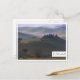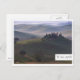 Carte postale d'une ferme dans le brouillard matinal à l'aube en Toscane entre les collines vallonnées de la vallée du Val d'Orcia entre Pienza et San Quirico d'Orcia en Italie avec un bord blanc et le texte : 'Toscane'.