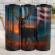 Dieses Kunstwerk besticht durch ein majestätisches Hirsch mit großen Antlern, die in einer Waldreinigung deutlich stehend sind. Der Hintergrund zeigt einen lebhaften Sonnenuntergang mit orangen, roten und blauen Farbtönen, der in einen Sternenhimmel übergeht. Oben rechts oben ist eine große amerikanische Flagge überlagert, die sich subtil in den Himmel einfügt. Der Vordergrund zeigt abgefallene Stämme und rötenes Blattwerk, was das natürliche, patriotische Thema des Stückes verstärkt.