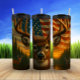 Ein majestätischer Buck mit prominenten Antlers steht vorne und Mitte, sein Blick direkt. Dahinter erstreckt sich eine pulsierende amerikanische Flagge über den Himmel, gebadet im warmen Licht eines Sonnenuntergangs über einer bewaldeten Landschaft mit einem ruhigen Gewässer. Kleinere Hirsche sind in der Ferne sichtbar, was das Gefühl einer großen Wildnislandschaft mit patriotischer Symbolik verstärkt.