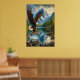 Dieses lebhafte Bild zeigt den Moment, in dem ein majestätischer Glatzadler mühelos abgleitet, um eine Seenforelle aus dem ruhigen Wasser eines Bergsees zu schnappen. Der Sonnenaufgang wirft ein sanftes Licht auf die schneebedeckten Gipfel, die pristinische Umgebung, wie die umliegenden Kiefern hoch und ungestört stehen.