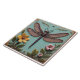 A square tile with a turquoise background, featuring a raised design of a dragonfly, flowers, and foliage. The dragonfly is centrally positioned with its body running vertically down the tile. It has a purple body with gold accents and large, detailed wings that are brown with purple veins and gold outlines.