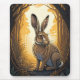 A detailed illustration of a hare sitting in a forest, framed by dense foliage. The warm light filtering through the trees highlights the hare's fur.