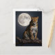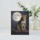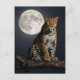 A powerful leopard with piercing yellow eyes and a sleek, spotted coat sits majestically on a stark, solitary branch. One paw dangles artfully across the center of the illustration, hinting at movement. Behind him, a vast, luminous harvest moon hangs in the inky night sky, casting an ethereal glow. Awesome postcard for anyone who loves leopards.