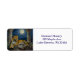 A leopard themed personalized return address labels. On the front is an illustration of a majestic leopard with fur like molten gold, laying on a cliff ledge bathed in ethereal moonlight. Intricate carvings adorn crumbling stone pillars, and bioluminescent flora casts a soft, otherworldly glow. The scene is rendered in a rich, textural oil painting style with thick strokes.