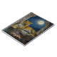 Leopard themed personalized notebook. On the front is an illustration of a majestic leopard with fur like molten gold, laying on a cliff ledge bathed in ethereal moonlight. Intricate carvings adorn crumbling stone pillars, and bioluminescent flora casts a soft, otherworldly glow. The scene is rendered in a rich, textural oil painting style with thick strokes.