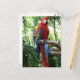 Ein Scharlachrot vor einem Hintergrund großer grüner Blätter. Diese lauten, roten und gelben Vögel sind auch als Rot und Gelb bekannt. Sie sind sehr hübsch zu sehen! Großartiges Fotodesign für jeden Papagei, Vogel oder Ara-Fan!