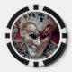This oil painting by Amanda Diehl features an intricate Venetian mask with elaborate gold and silver details adorning the playful, curly fins of the joker's hat and collar. The mask smiles gaily against a red velvet backdrop.