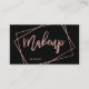 Eine moderne, stilvolle Nameschönheits-Geschäftskarte mit Bürstentypographie-Sprichwort Make-up der modernen Handbeschriftungsart elegantem in der Imitat-Rosen-Goldfolie auf einem geometrischen Imitat-Rosengold verdoppelt Streifenrahmen auf kundengerechtem Schwarzem. Wenn Sie irgendeine Kundenbezogenheit benötigen, zögern Sie nicht, wenn Sie mit mir in Verbindung treten