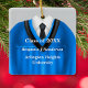 Personalisiertes zweiseitiges Abschluss-Sake-Ornament, das in den Farben Blau und Schwarz der Schule und Krawatte für den besonderen männlichen Senioren dekoriert ist. Viele andere Farbkombinationen für Männchen und Weibchen. Bearbeiten Sie im einfachen Texteditor Zazzle auf Vorder- und Rückseite benutzerdefinierte Texte.