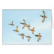 Zehn Stockenten fliegen in Formation durch einen strahlend blauen Himmel.