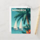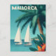 This vintage-style poster captures the serene beauty of Mallorca's coastline, where gentle waves meet golden beaches lined with swaying palm trees. Elegant sailing boats glide across the turquoise sea beneath a warm, sunlit sky. Rendered in soft retro colors and textures, the artwork evokes the charm of mid-century Mediterranean holidays — perfect for travel lovers and fans of vintage coastal design.