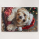This highly detailed, fine art photograph captures the elegance of the Maltese, seen wearing a jeweled Santa hat while resting on a luxurious crimson satin pillow surrounded by gold confetti. A beautiful and opulent holiday design for Maltese owners.