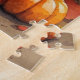 Ein Aquarellbild eines fröhlichen Hundes inmitten eines Haufen lebendiger Herbstlaub, umgeben von winzigen Kürbissen und verstreuten Eichhörnchen. Der Hund trägt einen kleinen Pilgerhut und strahlt vor Freude aus, um den Geist des Erntedanks zu erfassen. Im Hintergrund sorgen weiche Erntefelder und goldfarbene Bäume für eine friedliche Landschaft. Die sanfte Struktur und die warmen, gedämpften Herbsttöne verleihen der Szene ein gemütliches, nostalgisches Gefühl, das perfekt ist, um die Schönheit der Saison zu feiern.