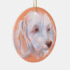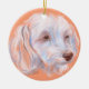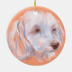 Dieses süß gemachte kleine weiße Maltipoo wird in sanften Pastelltönen auf einem warmen Terracotta Orange Papier gefangen.