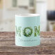 Schöne Tasse für Mütter mit floralen Blumenbriefen in Aquarellen, die M-O-M in mit individualisierbarem "Extra" in modernem Drehbuch auf pastellblauem Hintergrund auszeichnen