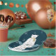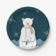 Adorable Teller mit einer Illustration eines kleinen Eisbären mit seiner schützenden Mutter auf dunkelblauem Hintergrund mit weißen Schneeflocken. Ideal für Babyduschen, Eisbärenliebhaber und Party-Feiern mit Kindern. Das Bild sieht so aus, als wäre es in drei Dimensionen, aber es ist nur ein Druck. Illustriert und entworfen von Patricia Alvarez.