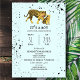 Eine Babydusche-Einladung, die ein Baby und einen Mama-Tiger illustriert, umgeben von schwarzem Spritzer auf hellblauem Hintergrund.
