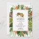 Eine Babydusche-Einladung, die eine Illustration eines Baby- und Mama-Tigers zeigt, umgeben von tropischem botanischem Design.