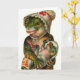 Adorable Vintage Darstellung von Tieren in menschlicher Kleidung. Das ist ein Mutterfrosch, der eine Motorhaube trägt und ihren kleinen Frosch in den Armen hält