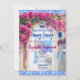 Aquarellmalte griechische Insel Mamma Mia-Thema Design "sie fand ihren Honig Honig" mit magenta rosa Bougainvillea Blume und blauen mediterranen Kacheln.