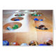 Fotografie eines Holzmankala-Brettes mit bunten Glasspielstücken oder Steinen (Samen) in Gruben.