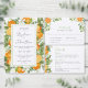 Mandarinenorangen, Blätter und Blüten. Sie können die Farbe des Schriftartes und des Schriftartes ändern. Die Einladung hat ein passendes orangefarbenes Muster auf der Rückseite.