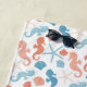 Mandarine Korallen und Ceruléblau sind die Farben dieses hübschen Wassersporttuchs. Bilder von Seepferden, Muscheln und Seestern bilden das sich wiederholende Muster. In der Mitte befindet sich ein passend blauer verzierter Banner mit Ihrem Monogramm und Namen in Mandarine und Blau. Alles ist auf einem weißen Hintergrund platziert. Niedlich!