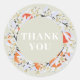 Eleganter und schicker Hochzeitsaufkleber mit wunderschönem Kranz und Mandarine "Danke". Blütenbotanische Illustration mit federempfindlichen Blume, blühenden Ästen und Zitrusfrüchten. Pastellgrün und orange.