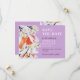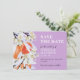 Elegante und schicke Ankündigung Datum freihalten mit wunderschönen blühenden Zweigen der Mandarine. Blütenbotanische Karte mit zarten Frühlingsfrühlingserzeugnissen, Blume und Zitrusfrüchten. Orange, Pastellfarben und Lila. Personalisieren Sie Ihren Text.