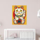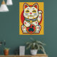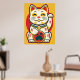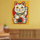 Diese lebendige Abbildung zeigt ein traditionelles japanisches Maneki Neko, oder "Lucky Cat", dargestellt in einem charmanten und skurrilen Stil. Die Katze wird aufrecht sitzend gezeigt und ihre links Pfote in einer einladenden Geste gehoben, von der angenommen wird, dass sie Glück und Glück bringt. Die Katze hat einen zauberhaften und fröhlichen Ausdruck, mit ihren weiten Augen und dem Mund gekrümmt zu einem sanften Lächeln. Das Maneki Neko ist vorwiegend weiß mit gelben und roten Farbtupfern gestaltet, was dem Design eine lebhafte und farbenfrohe Touch verleiht. Es trägt einen grünen Kragen, der mit einer goldenen Glocke geschmückt ist und Wohlstand und Wohlstand symbolisiert. Die Katze hat eine große, rote Münze mit schwarzen Pfotendrucken, die ihre Rolle als Glücksbringer und Glücksbringer noch weiter unterstreichen. Der Hintergrund weist einen kühlen roten Kreis auf, der das helle und fröhliche Aussehen der Katze steigert. Das Gesamtbild ist Retro, leicht bedrückt, und verleiht ihm ein nostalgisches und zeitloses Gefühl.