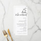 Ce menu mariage présente une belle police de caractères affichant les mots "manger, boire et être marié" pour une façon élégante d'afficher votre menu mariage à vos invités.