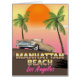Manhattan Strand Los Angeles Retro oder Vintages Reiseposter eines alten amerikanischen Vintage-Autos auf einer Straße mit Palmen in einem heißen Abend Sonnenuntergang.