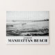 Dieses Schwarz-Weiß-Puzzle bietet einen atemberaubenden Blick auf den Manhattan Beach Pier, der vom Ozean aus aufgenommen wurde. Das Foto im Vintagen Stil zeigt den Steg, der sich bis ins Meer erstreckt, und der Strand und die umliegende Küste sind im Hintergrund sichtbar. Es ist das perfekte Souvenir oder Geschenk für Strandliebhaber, Fans der modernen Fotografie der Mitte des Jahrhunderts oder alle, die Lieben der kalifornischen Küste.
