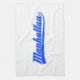 Manhattan, New York City, geschrieben mit einem Swash (Schwanz). Schriftart in Weiß und Blau. Originelles Textdesign.