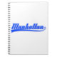 Manhattan, New York City, geschrieben mit einem Swash (Schwanz). Schriftart in Weiß und Blau. Originelles Textdesign.