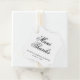 Elegantes typografisches Brautparty bevorzugt Tags mit einem einfachen Design mit der Meldung "Mani Danke" in schwarzer Kalligrafie und Ihrem Namen, Datum der Veranstaltung unten, auf einem weißen Hintergrund. Die Schriftart und Hintergrundfarben können beliebig verändert werden. Diese extravaganten und klassischen Tags sind ideal für eine schicke Braut und fügen Ihren Lieblingen eine persönliche Touch hinzu.