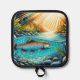 Illustration numérique colorée et détaillée d'une truite dans une rivière claire entourée d'une verdure éclatante et éclairée par un soleil doré, alliant sérénité naturelle et dynamisme artistique.