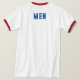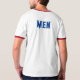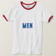 Men Text oder Name oder Word mit Deep Blue Color Text und The Style ist ein Ringer-T - Shirt, der Farbtyp ist weiß/rot und der Formattyp ist Adult L.