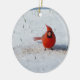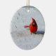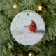 Ein schöner männlicher Kardinal im Schnee wird auf dieser Keramikverzierung gekennzeichnet.