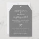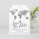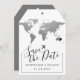 Eine Gepäckmarke geformt Hochzeit in Urlaubsort Save the Date mit einem Imitat Silber-Folie Weltkarte mit einem bearbeitbaren Herz-Positionsmarker und romantischem Flugzeugsymbol. Wählen Sie Ihre eigene Hintergrundfarbe auf der Rückseite der Tag-Karte, um sich mit Ihrem Reisethema Hochzeitsfarben abzustimmen.