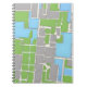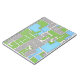 Eine Vogelperspektive einer Stadt mit verschiedenen Formen und einem Farbschema aus Grau, Grün und Blau.