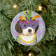 Niedlicher Beagle Welpe, gekleidet in festlicher Federmaske und Perlen, bereit für Spaß auf Mardi Gras oder zu jeder anderen Zeit. Gutes Geschenk für sich und Ihre Beagle liebende Familie und Freunde.