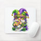 Ein skurriler Gnom, geschmückt mit einer lebendigen Mardi Gras-Maske und Narrenkappe, genießt glücklich ein Stück King Cake, während er bunte Perlen trägt