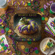 Präsentieren Sie Ihren köstlichen Mardi Gras King Cake mit lila, gelben und grünen Zuckerguss und einer kleinen Krone.