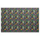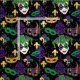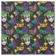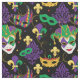 Mardi Gras gemusterte Stoffe mit karnevalen Gesichtsmasken, Fleur de lys motifs und Jestermasken in lila, grün und goldfarben